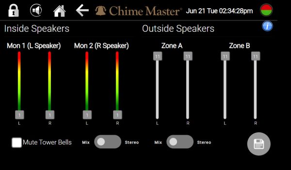 This screen configures the default volume levels. Changes made on other screens or scheduled events are temporary, and the system will return to these default settings you save. Zones A and B are the two outside speaker channels.